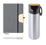 Set cadou premium care include un caiet din piele PU, cu insertie din bambus, 80 de foi dictando si functie de suport pentru telefonul mobil; un termos din otel inoxidabil cu perete dublu (640 ml) cu capac din bambus; si un pix din aluminiu cu insertie de bambus, finisaj mat si mina albastra. Sticla nu este potrivita pentru bauturi carbogazoase. Material 1:Aluminiu Material 2:Bambus Material 3:Otel inoxidabil Material 4:Piele PU Dimensiune:325×80×276 mm Tip instrumente de scris:Pix Culoare mina:albastra Foaie carnetel:Dictando Tip perete:Dublu Tip de izolatie:Izolatie vacuum Greutate:1200grame Tara de origine:CN |
